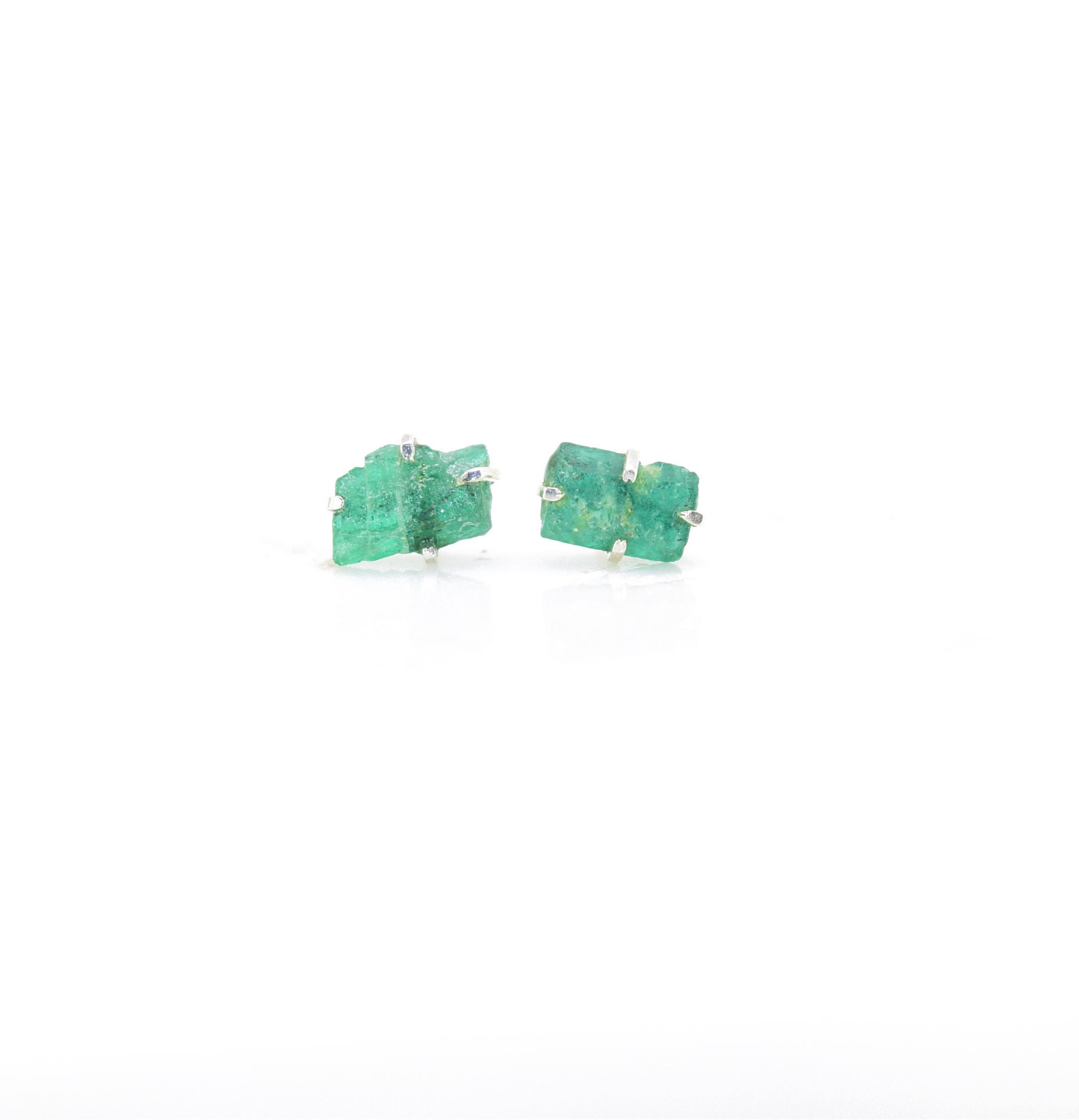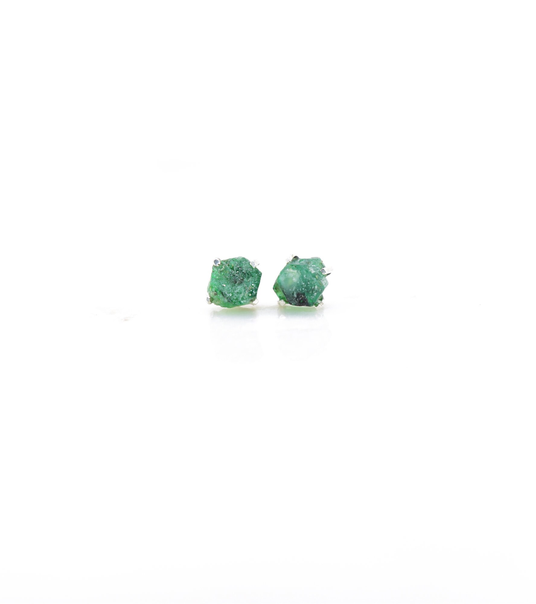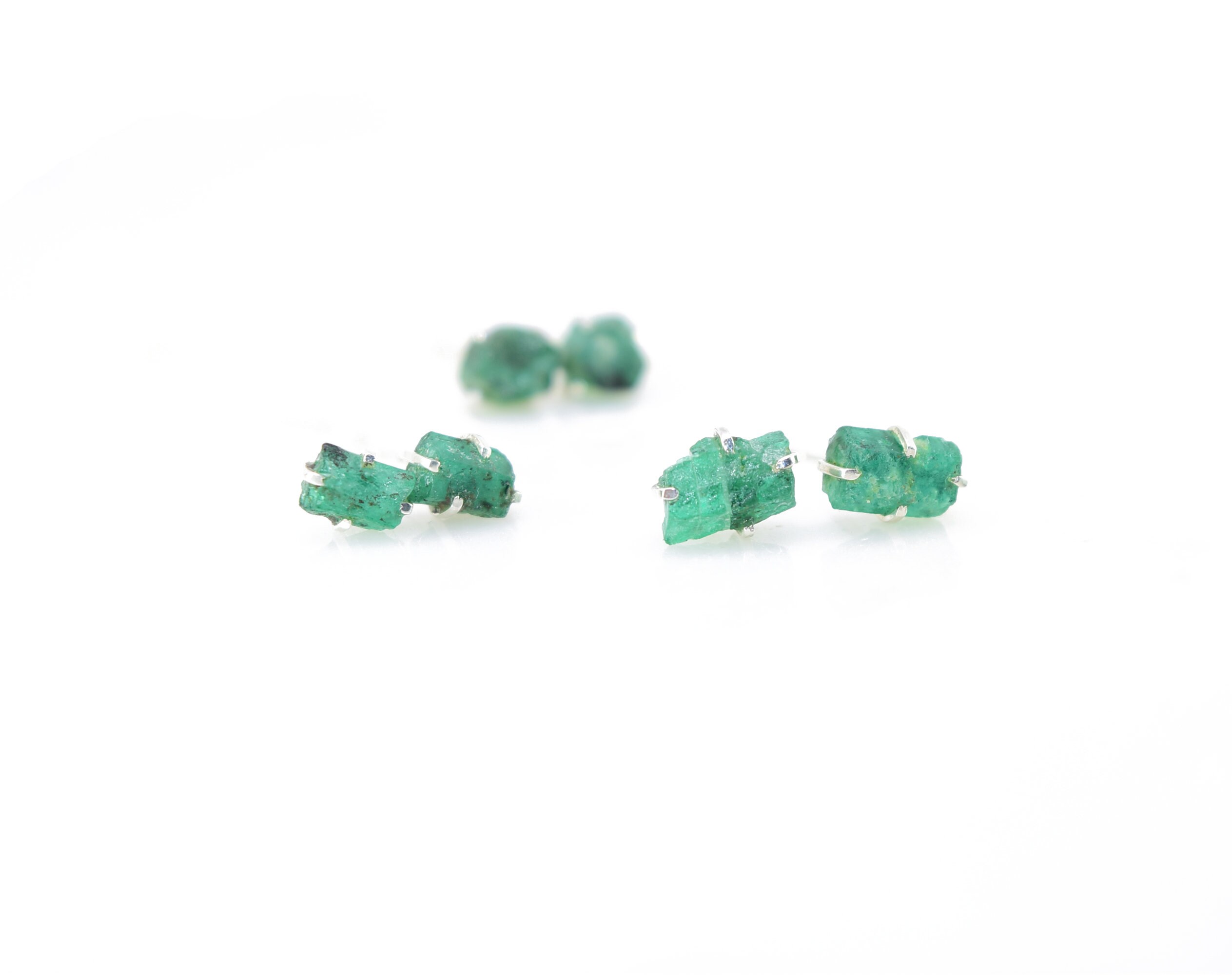 The Pure Raw Emeralds form these one of a kind stud earrings. Each stone varies. No two stones alike. Stone sizes vary, but most will be between 7-8mm. THE PERFECT STUD SIZE.