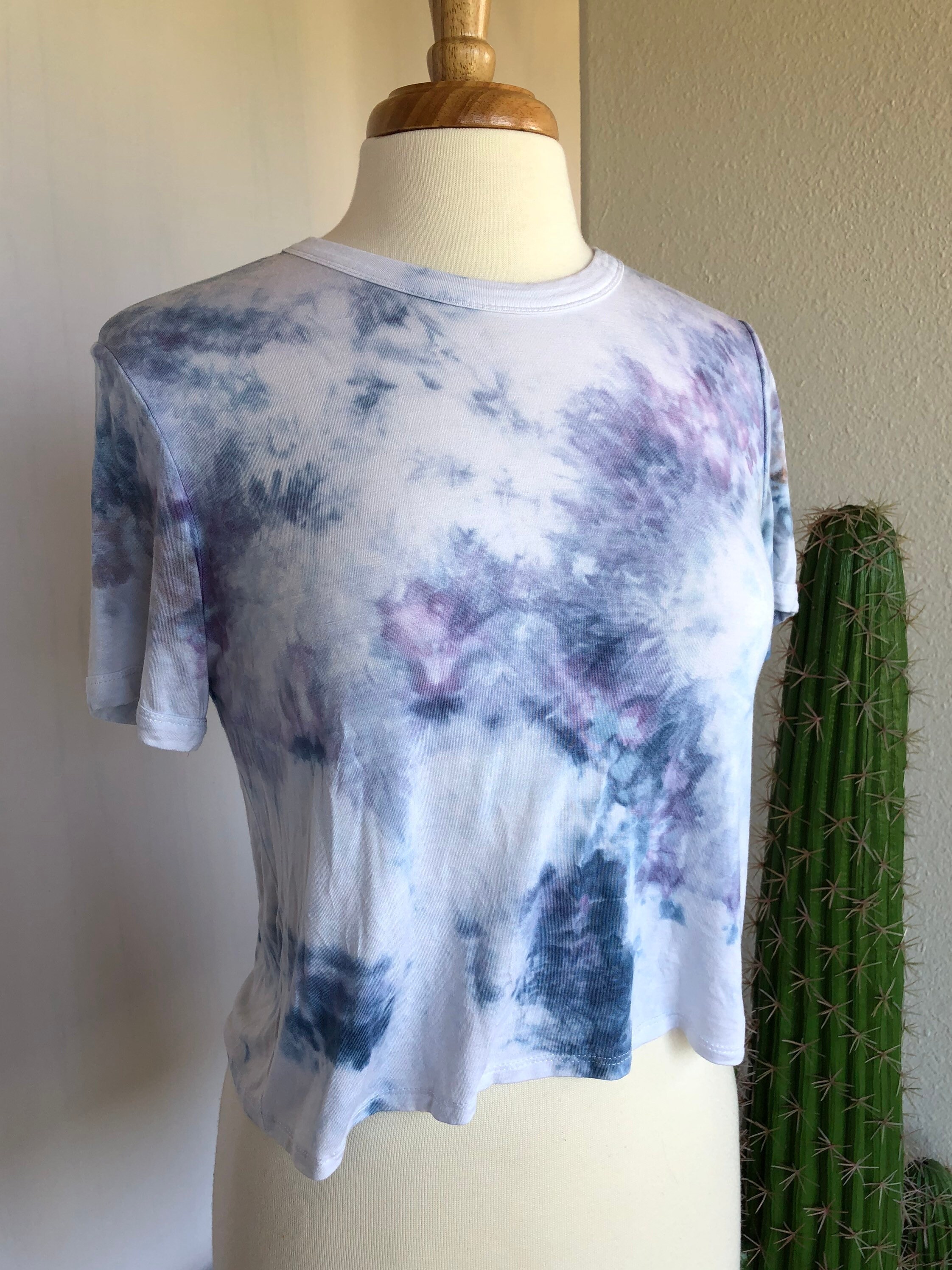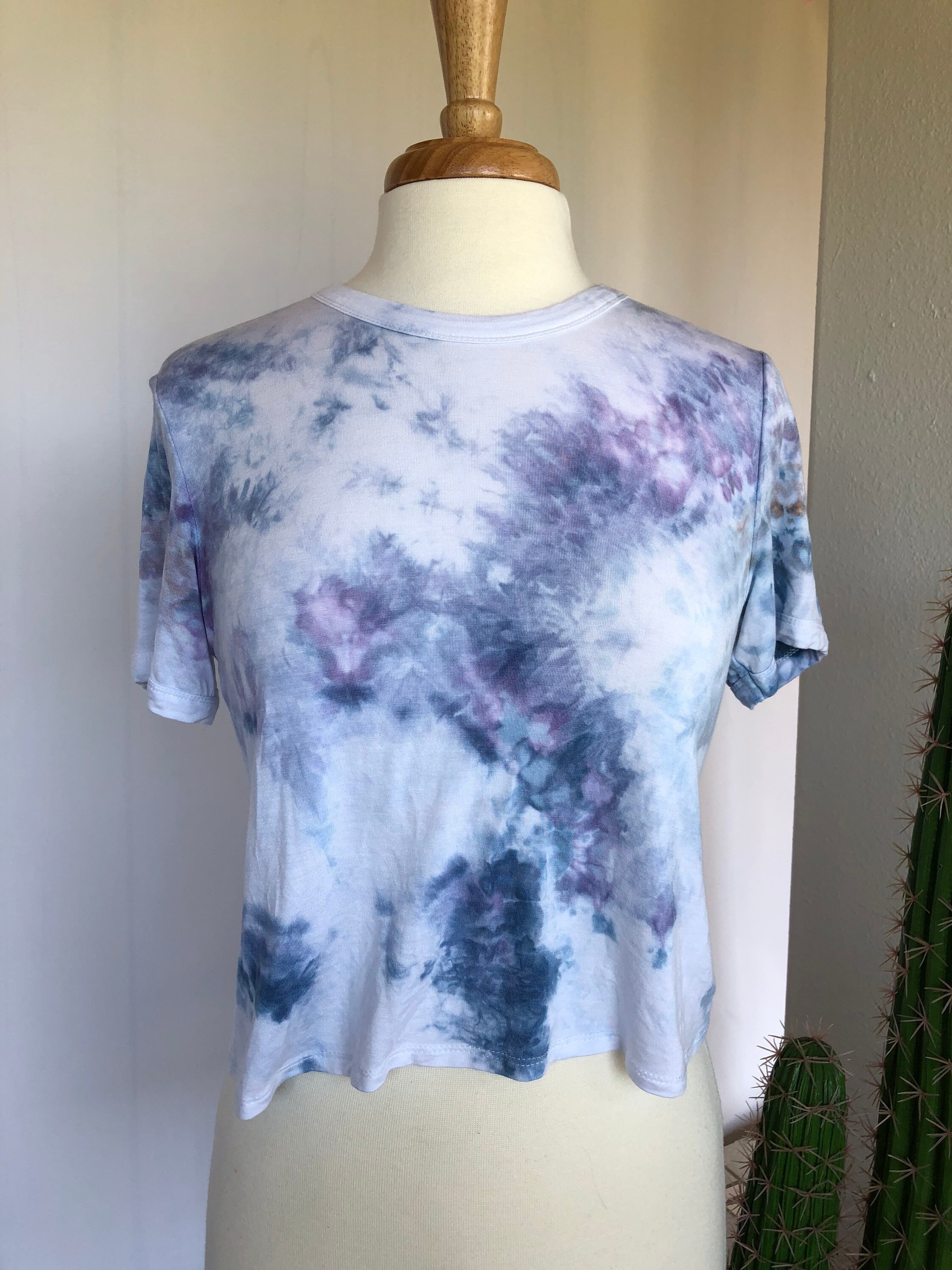 This shirt was hand dyed using the ice dye technique. I used a new super soft Rayon/Spandex crop t-shirt, then hand dyed. ONE OF A KIND.