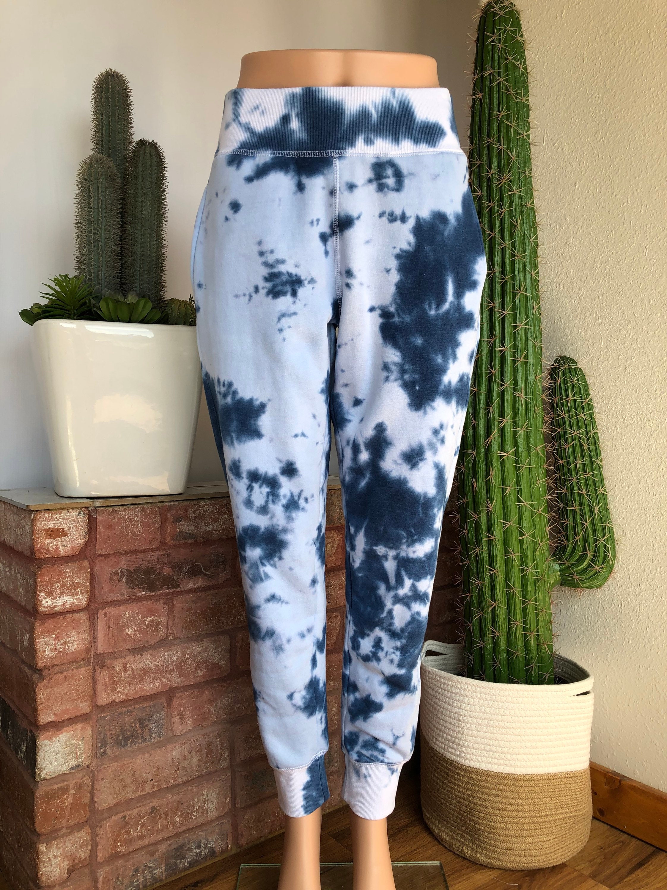 Each pair of sweatpants is hand dyed and one of a kind. I use the same methods and colors to dye each piece, but the actual results and patterns will vary due to ice dying having a dream pattern made by nature; making each pc unique. No 2 alike.