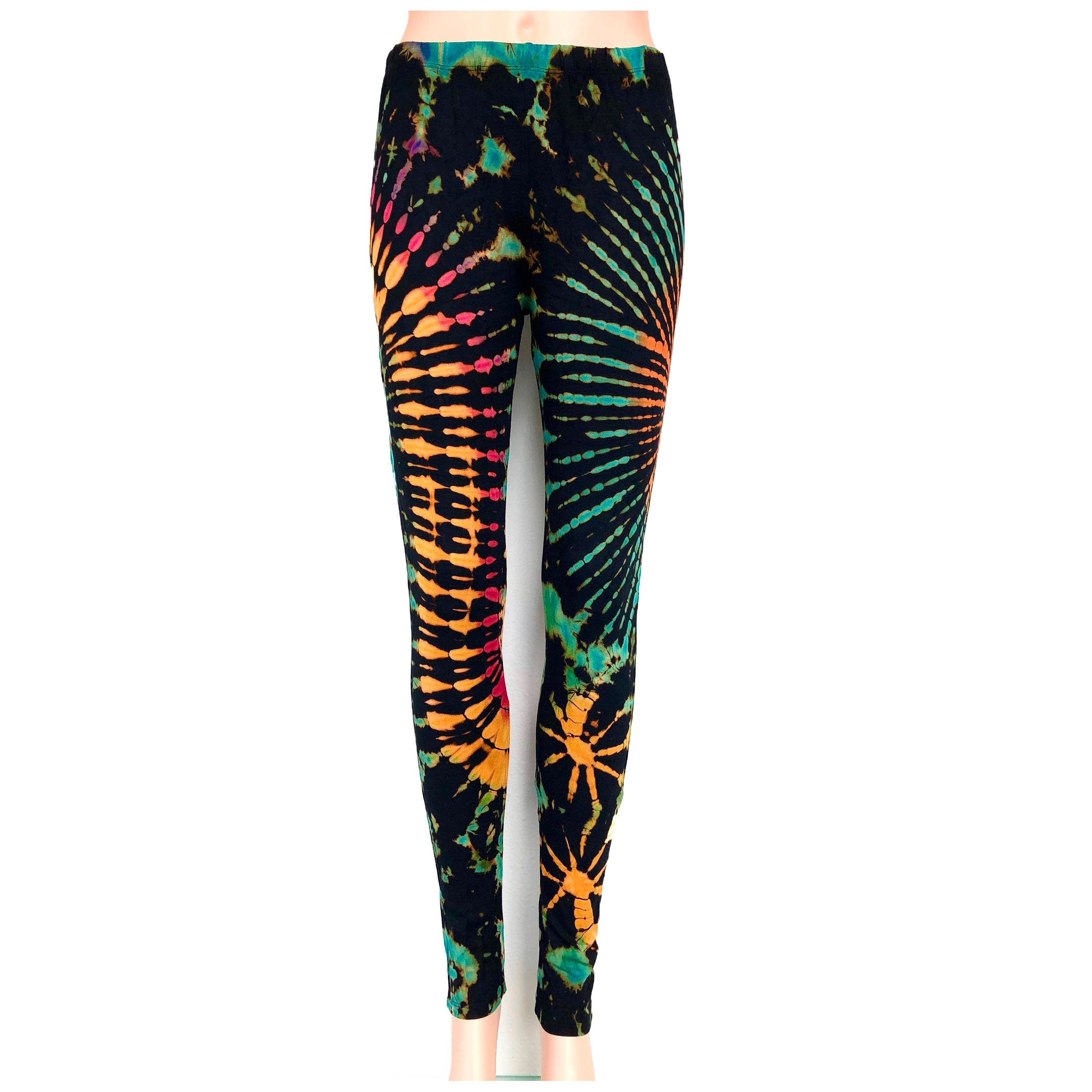 Each pair of leggings is hand dyed and one of a kind. I use the same methods and colors to dye each piece, but the actual results and patterns will vary slightly; making each pc unique. No 2 alike.
